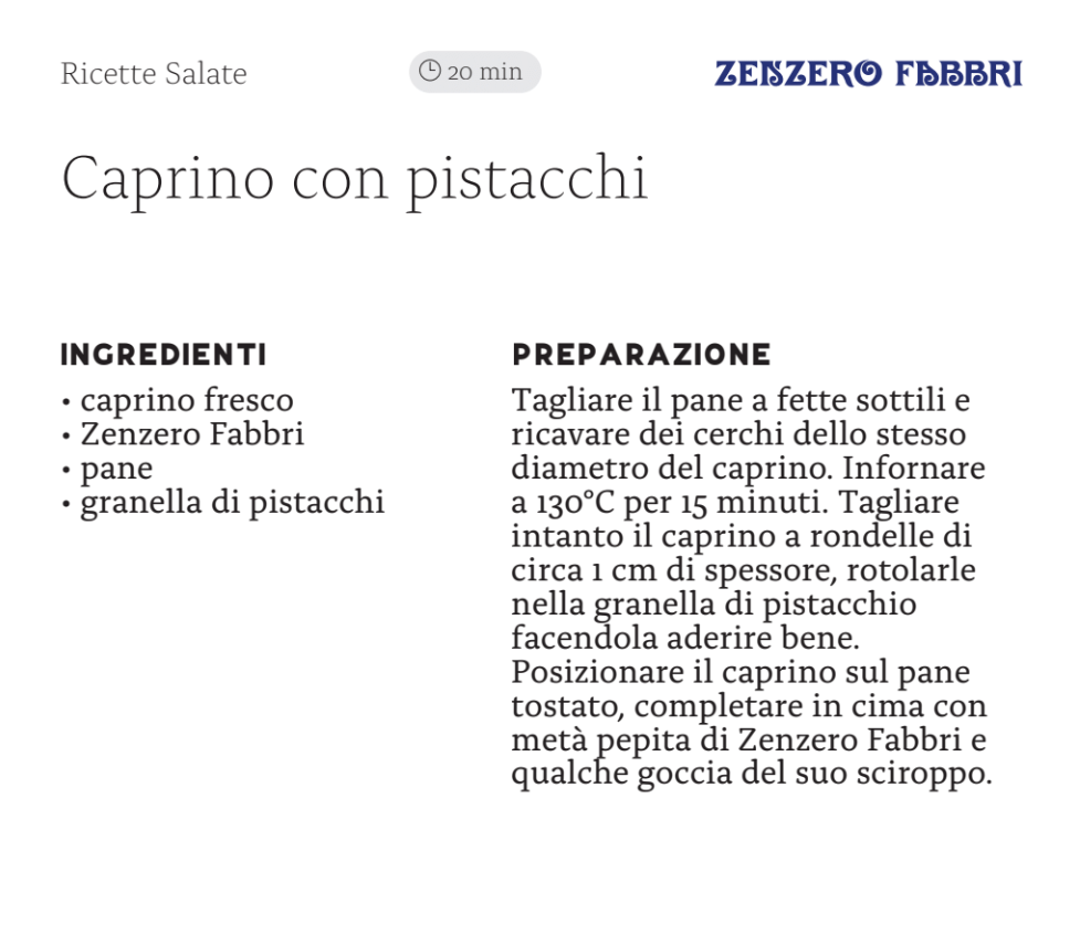 Abbiamo sfogliato il ricettario creato dall’azienda bolognese insieme alla cuoca fondatrice di Giallo Zafferano Sonia Peronaci, per sperimentare un cocktail (Spritz rivisitato), un mocktail (Lemonade) e una ricetta (caprino con pistacchi) dove impiegare la ‘meraviglia dell’universo’ in “drink pairing”. E che Zingiber sia.