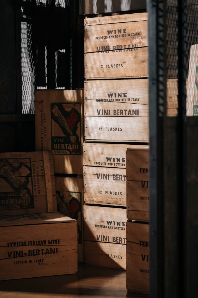 Il restauro degli spazi storici e la creazione delle nuove sale dedicate all’ospitalità si integrano armoniosamente, in equilibrio tra passato e presente. Il progetto ha permesso di recuperare oggetti ordinari, utilizzati nei decenni da Bertani per la sua produzione, trasformandoli in pezzi di design, perfettamente integrati nel percorso. Ne è un esempio le arelle appese al muro, utilizzate per l’appassimento delle uve, che si trasformano in iconici elementi visivi che rievocano la storia della cantina, o i timbri utilizzati per le casse, che oggi, con un gioco di specchi, entrano nell’arredamento della prima sala d’accoglienza.