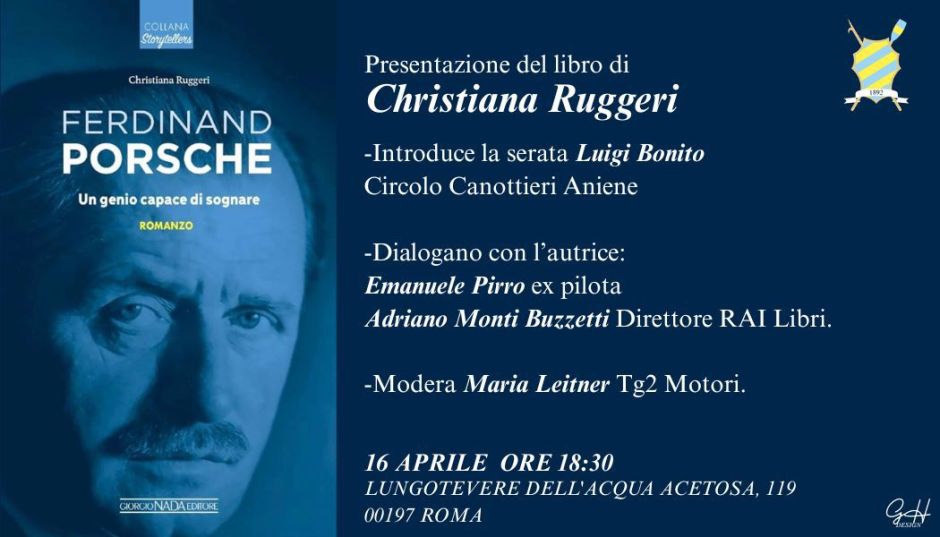 Dopo il Premio “Storie di Donne”, la giornalista del Tg2 Christiana Ruggeri torna in libreria con “Ferdinand Porsche. Un genio capace di sognare” (Giorgio Nada Editore). Il volume ripercorre, in forma di romanzo, l’incredibile vita dell’”ingegnere del secolo”, tra ricerca storica e backstage privato, la Ruggeri svela un Porsche inedito: un visionario timido, segnato dalle guerre e dal carcere, ma sostenuto da profondi legami affettivi. “Era necessario conoscere l’uomo dietro il brand”, spiega l’autrice, celebrando un talento che ha saputo trasformare l’utopia in realtà automobilistica. Alle 18:30 Lungotevere dell’Acqua Acetosa, 119 -Roma.