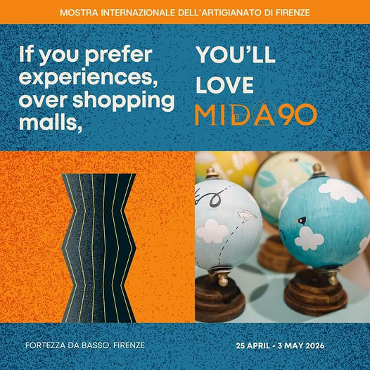 Dal 25 aprile al 3 maggio torna a Firenze MIDA – Mostra Internazionale dell’Artigianato, che celebra la sua 90ª edizione tra esposizioni, laboratori ed eventi dedicati al saper fare. Ogni giorno dalle 10 alle 20, con street food e musica serale, la manifestazione riunisce artigiani italiani e internazionali. Biglietti da 8 euro, riduzioni e gratuità previste. Info e programma: www.mostrartigianato.it